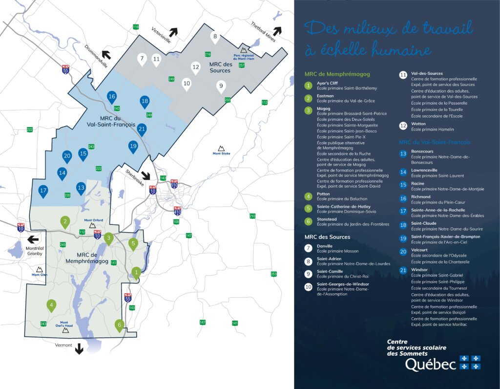 Le Centre de services scolaire des Sommets regroupe un centre administratif, 28 écoles primaires, quatre écoles secondaires, un centre de formation professionnelle et un centre de formation générale des adultes. Nos établissements sont répartis dans les MRC des Sources, du Val-Saint-François et de Memphrémagog, un territoire qui couvre près de 3 501 km2.