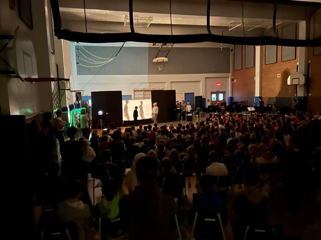 La soirée s’est poursuivie avec un spectacle musical mettant en vedette la chorale de l’école, composée de 89 jeunes chanteurs et chanteuses de 6-7 ans, ainsi qu’une prestation de l’harmonie. Ce moment artistique a également permis de mettre en lumière le fonctionnement particulier du 3e cycle, où deux défis sont jumelés — un en 5e année et un en 6e année — regroupant les élèves dans une même classe, soit au sein du défi en harmonie ou du défi en multimédia. Les élèves de l’harmonie ont offert une prestation enrichie par un théâtre d’ombres chinoises intégrant des effets d’animation, le tout soutenu par des pièces musicales préparées avec soin.